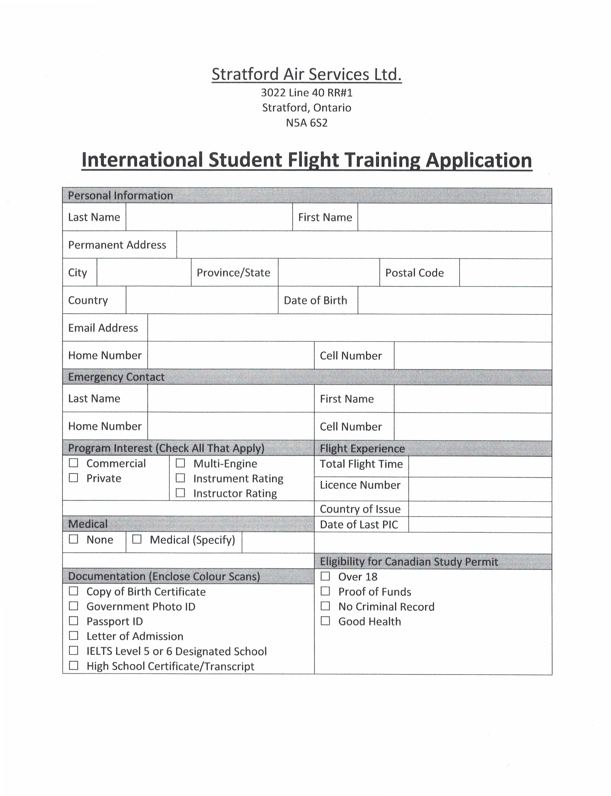 - Complete attached student application and send by FAX (519-271-2473) or email (andy@stratfordairservicesltd.ca) with attached documentation listed on application form. A $100.00 non-refundable fee (Visa or Mastercard) is required when the application is received by us.